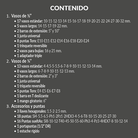 - 108 piezas en Cromo Vanadio. Maletin de plástico sólido