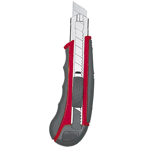 - Cutter con bloqueo automático. Cuerpo Rojo ABS + TPR con goma Gris, Tamaño: 157x45x26mm. Hoja de acero al carbono: 100 mm x 18 mm. 8 cuchillas