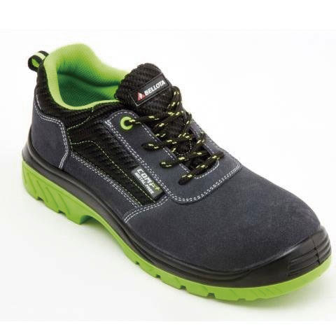 - Zapato de serraje ligero y flexible, certificado según norma europea UNE-EN ISO 20345. Suela doble densidad con zona amortiguadora de impacto en el talón. Suela resistente a aceites, hidrocarburos y a la abrasión.Puntera de seguridad no metálica anti-impactos 200J.Plantilla antiperforación no metálica. Protege el 100% de la superficie plantar.