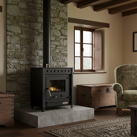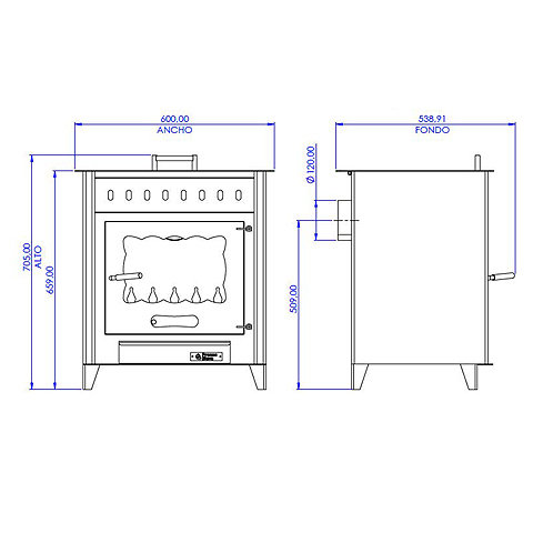 - Medidas: Ancho 60 x Alto 71 x Fondo 54 cm - Chimenea 150 mm. - Chapa acero de 4 mm. - Peso: 70 Kg.