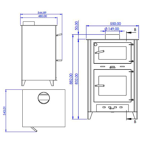 - Medidas: Ancho 55 x Alto 87 x Fondo 54 cm - Chimenea 150 mm. - Potencia térmica 13 Kw - Eficiencia 78% - Chapa acero de 4 mm. - Peso: 102 Kg.