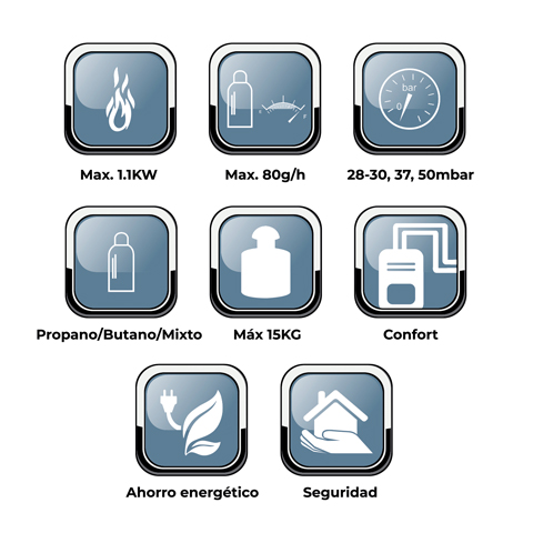 - Tipo de gas: Propano, butano y mixtos (LPG) - Potencia calorífica: máx. 1.1KW / 0.45KW - Ignición: Piezo-eléctrico - Sistema ODS incluido - Sistema de fallo de llama - Alta eficiencia térmica - Válido para interior y exterior - Altura: 188.4 mm. - Diámetro: 300 mm.