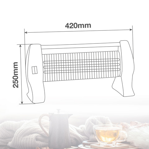- 3 tubos de cuarzo - Dispositivo antivuelco - 3 niveles de calefacción - Material: Polipropileno - Área de cobertura 20 m2 - Potencia máxima: 1200 W.