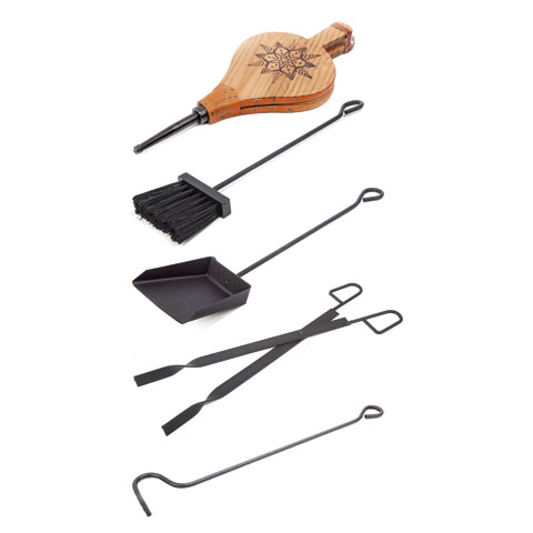 - Juego de chimenea de hierro fundido compuesto por: 1 pinzas, 1 cogedor de cenizas, una escobilla, 1 gancho y 1 fuelle. Medidas: 230 x 750 MM