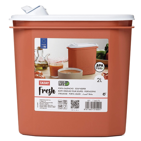 - Porta Gazpacho y Alimentos Fresh, 2L de Capacidad, Libre de BPA, Apto Lavavajillas y Microondas, Medidas 18,4 x 9,7 x 19 cm
