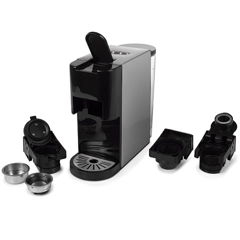 - Capacidad 0,8 l - Presión: 19 bar - Bomba italiana - Material: Acero inoxidable - Adecuado variedades café: Café molido, Cápsula DolceGusto, Cápsula Nespresso, E.S.E pads - Cantidad café ajustable - Apagado automático - Indicador de nivel de agua - Depósito de agua extraíble - Potencia: 1450 W.