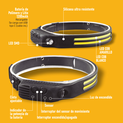 - 300 lúmenes, 3W LED 2 COB+SMD - Clasificación IP44 resistente al agua - Sensor de activación - Batería recargable 1200 mAh - 8 modos: COB blanco 100, 50% / COB amarillo 100, 50% / SMD 100, 50% - COB blanco y amarillo 100% / COB blanco y amarillo flash - Cinta elástica ajustable - Medidas: 310x30x30 mm. - Peso: 95 gr.