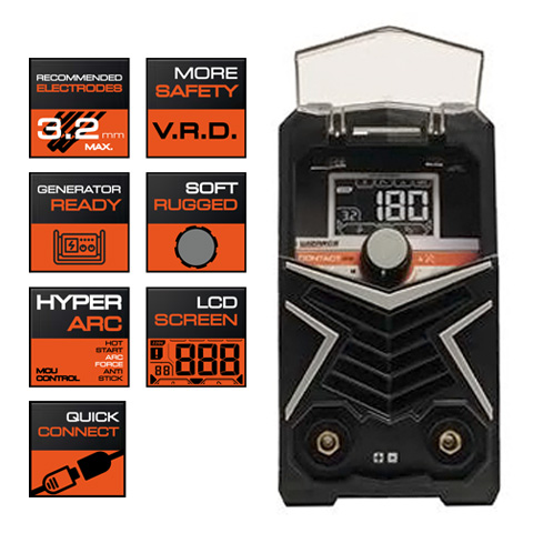 - Electrodos de hasta 3,2 mm. de diámetro - Sistema de seguridad V.D.R. (Voltage Reduction Device), reduce el riesgo de choque eléctrico - Puede conectarse a generadores de 230V con una potencia mínima de 6.5 Kw nominal - Perilla en goma, para un mejor agarre con guantes - HYPER-ARC, con HOT START, ARC FORCE y ANTI-STICK. - Pantalla LCD de alto contraste - Conectores rápidos tipo DINSE 10/25.