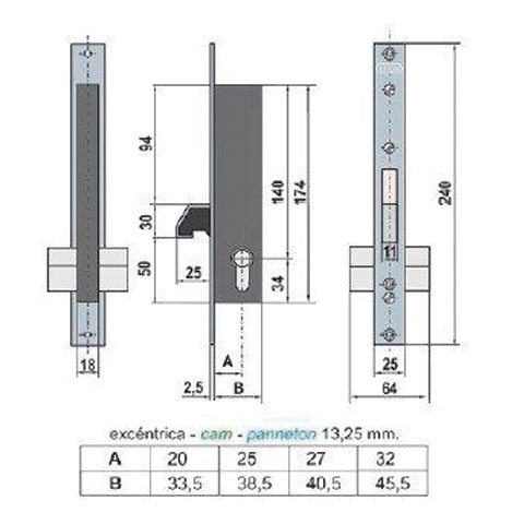 - Cerradura de frente en acero inoxidable Palanca de gancho. Leva de 13,25 mm