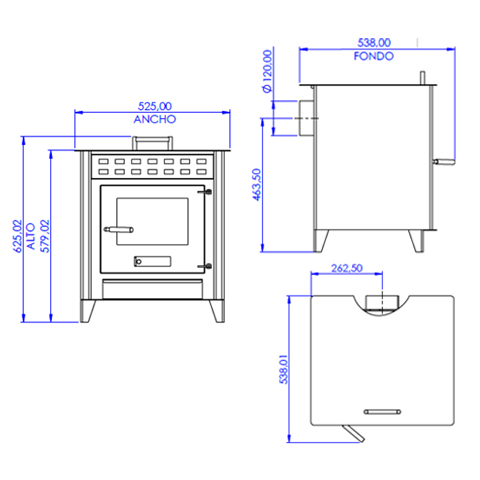 - El modelo PRO21 es una estufa de leña tradicional de gran grosor y fabricada en acero para una mayor potencia calorífica y vida útil - Estufa con parrilla y horno - Medidas: Ancho 60 x Alto 70,5 x Fondo 53,8 cm, peso 70 Kg. - Chimenea 120 mm - Potencia térmica 14,3 Kw, eficiencia 82%, combustible leña - Medidas del horno: Ancho 54 x Alto 9 x Fondo 37,5 cm - Cámara de combustión: Ancho 54,2 x Alto 50,5 x Fondo 37,8 cm - Cuerpo Chapa acero de 4mm., cristal de vidrio cerámico transparente de 4 mm - Norma EcoDesing 2022.