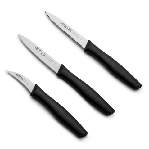 - Juego de 3 cuchillos mondadores serie nova 60 mm y 100 mm de elegante color negro - Con hojas diferentes para pelar, cortar y decorar - Material de vanguardia: Acero inoxidable NITRUM que garantiza firmeza, precisión y calidad en cada corte - Mango ergonómico: Hecho de polipropileno que le propociona resistencia al calor, durabilidad y un buen agarre durante el uso.