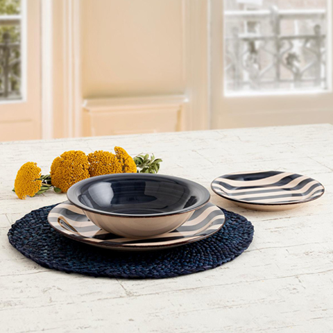 - Gran tamaño - Material cálido y natural - Pintado a mano - 6 platos llanos 27 cm, 6 platos hondos 21,5 cm y 6 platos postre 19 cm - Apta para microondas y lavavajillas - Seque los platos por las dos caras después de cada lavado - Evite dejar los platos en el lavavajillas una vez este haya finalizado - Guarde los platos en un lugar seco y ventilado - Material: Cerámica.