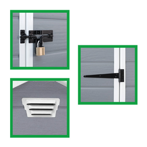 - Paredes de 12 mm. de polipropileno de doble capa - Estructuras reforzadas de PVC y polipropileno - Herrajes acabados en negro - Techo a dos aguas biselado reforzado - Protección UV y resistente al agua.