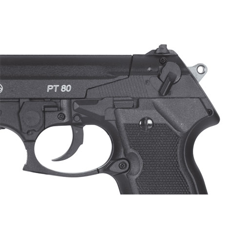 - Pistola de CO2 de metal PT-80. El cargador rotativo puede disparar 8 balines en 1,6 segundos.Incluye: Balines Match y maletín. Longitud 18 cm. Peso 500 gr, Velocidad 120 m/s